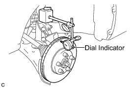 (c) Using a dial indicator, measure the disc runout 10 mm (0.394 in.) away from the outer edge of the front disc.