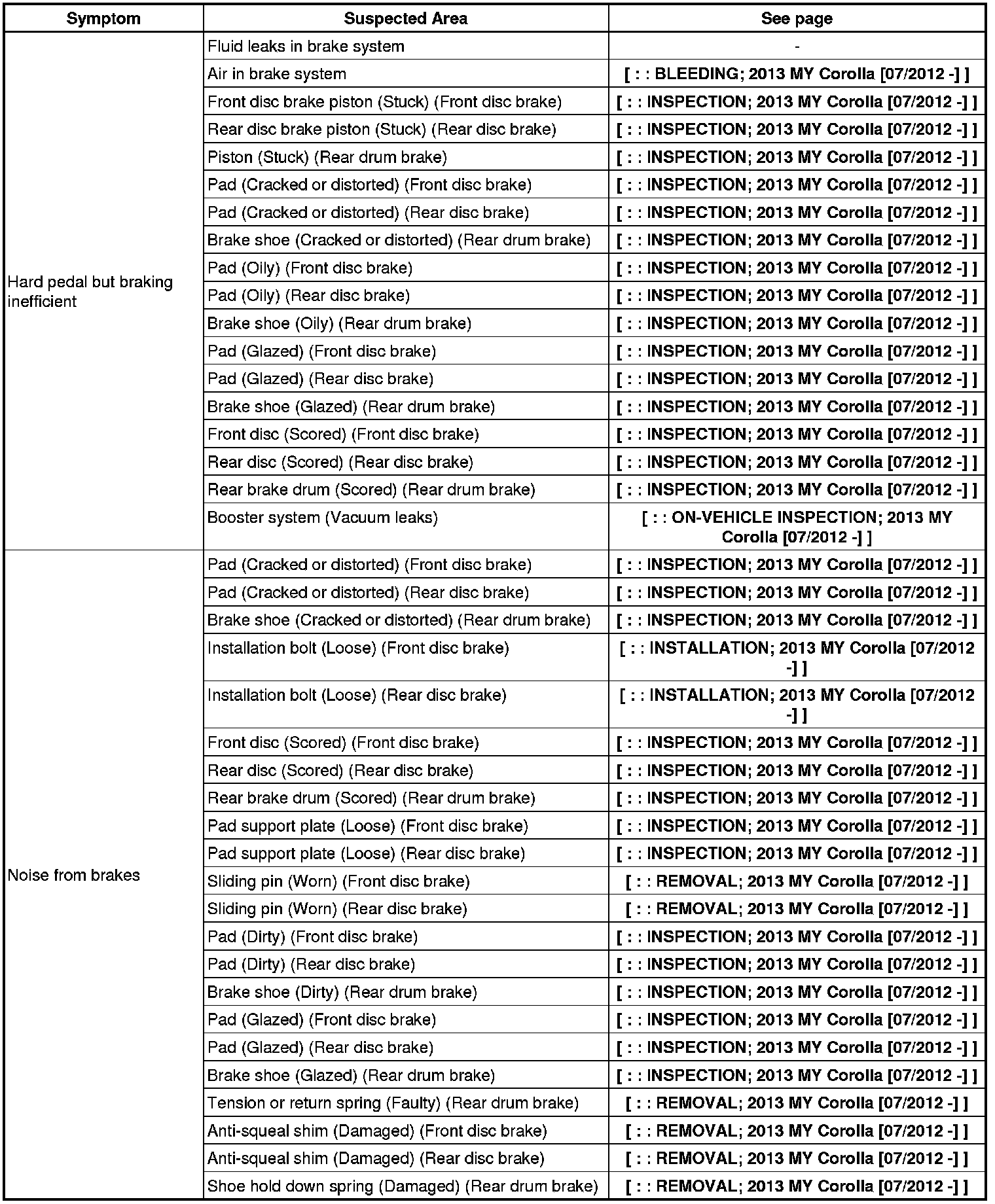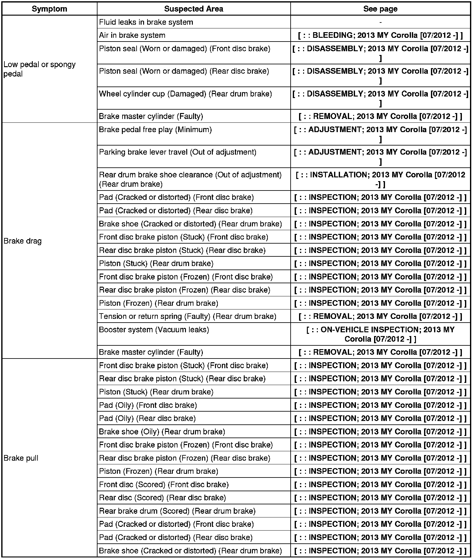 BRAKE SYSTEM (OTHER): BRAKE SYSTEM: PROBLEM SYMPTOMS TABLE; 2013 MY Corolla [07/2012 -]