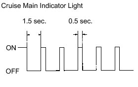 While driving with cruise control, the ECM activates AUTO CANCEL of the cruise control system when a malfunction occurs in one of the following: vehicle speed sensors, stop light switch assembly, or other related parts. When AUTO CANCEL is activated, the CRUISE main indicator light outputs the blinking pattern as shown in the illustration. At the same time, data of the malfunction is stored as a DTC.