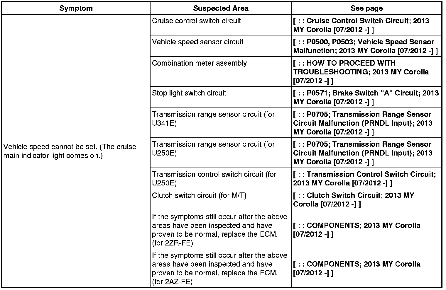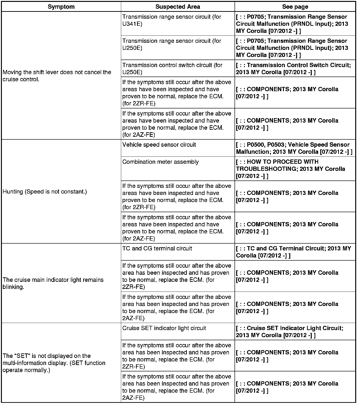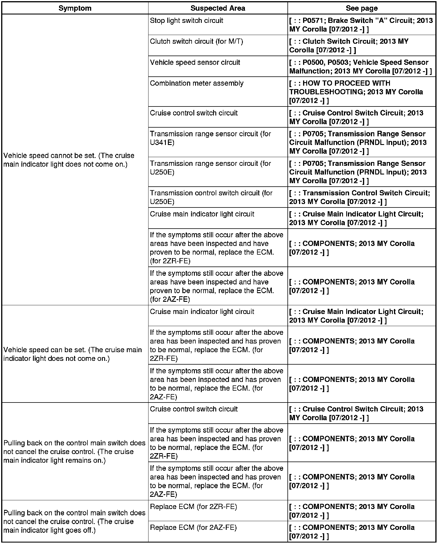 CRUISE CONTROL: CRUISE CONTROL SYSTEM: PROBLEM SYMPTOMS TABLE; 2013 MY Corolla [07/2012 -]