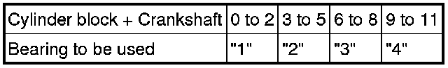 * If replacing a bearing, select a new one with the same number. If the number of the bearing cannot be determined, calculate the correct bearing number by adding together the numbers imprinted on the cylinder block and crankshaft. Then select a new bearing with the calculated number according to the chart below. There are 4 sizes of standard bearings, marked "1", "2", "3" and "4" accordingly.