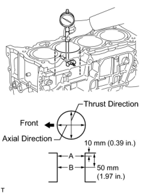 (a) Using a cylinder gauge, measure the cylinder bore diameter at positions A and B in both thrust and axial directions.