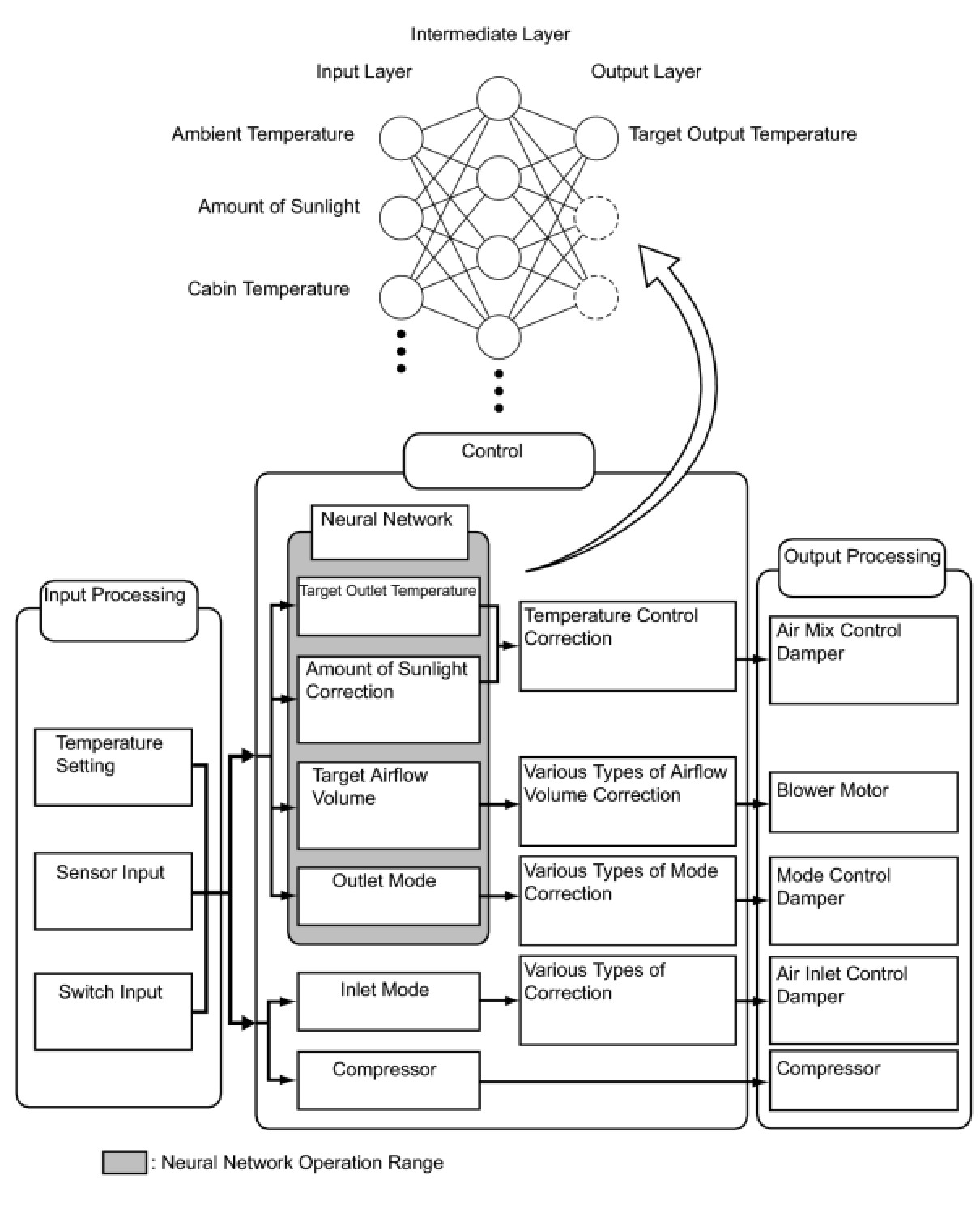 * The neural network control consists of neurons in the input layer, intermediate layer, and output layer. The input layer neurons process the input data of the outside temperature, the amount of sunlight, and the cabin temperature based on the outputs of the switches and sensors, and output them to the intermediate layer neurons. Based on this data, the intermediate layer neurons adjust the strength of the links among the neurons. The sum of these is then calculated by the output layer neurons in the form of the required outlet temperature, solar correction, target airflow volume, and outlet mode control volume. Accordingly, the A/C amplifier controls the servo motors and blower motor in accordance with the control volumes that have been calculated by the neural network control.