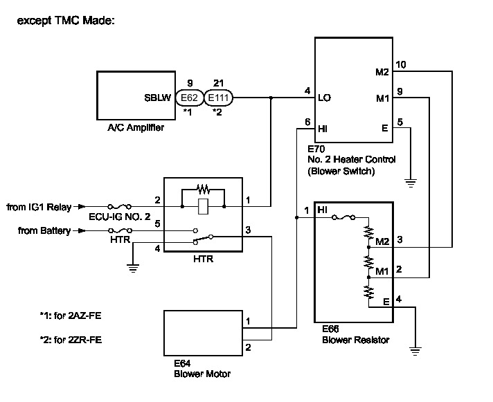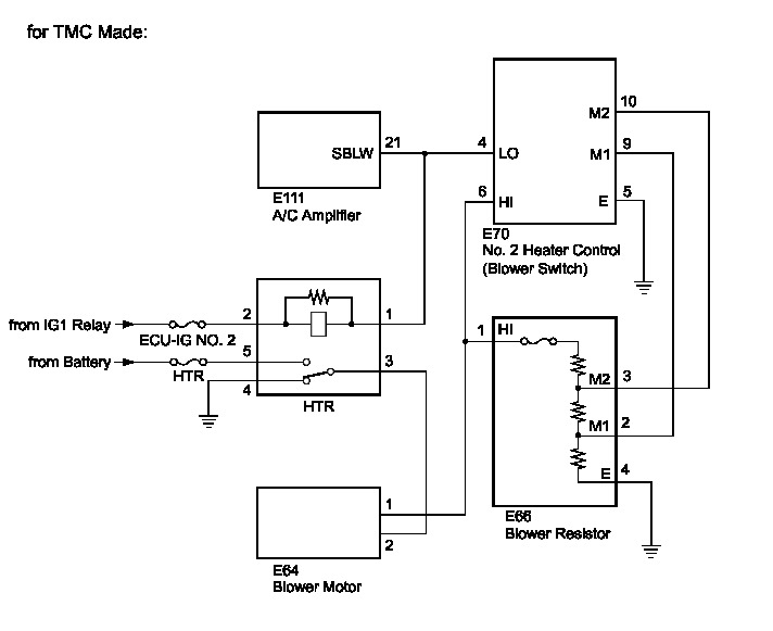 When the No. 2 heater control (blower switch) is operated, the HTR relay will turn on and send current to operate the blower motor. Operating the No. 2 heater control (blower switch) adjusts the flow of current between the blower resistor and body ground, thus, adjusting the speed of the blower motor.