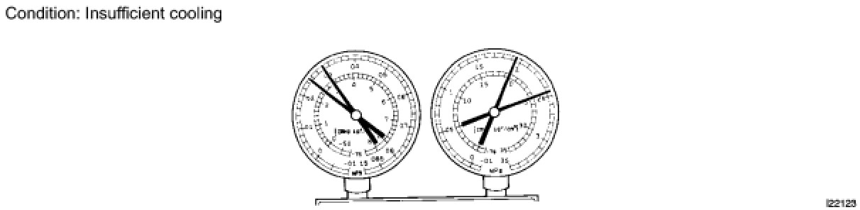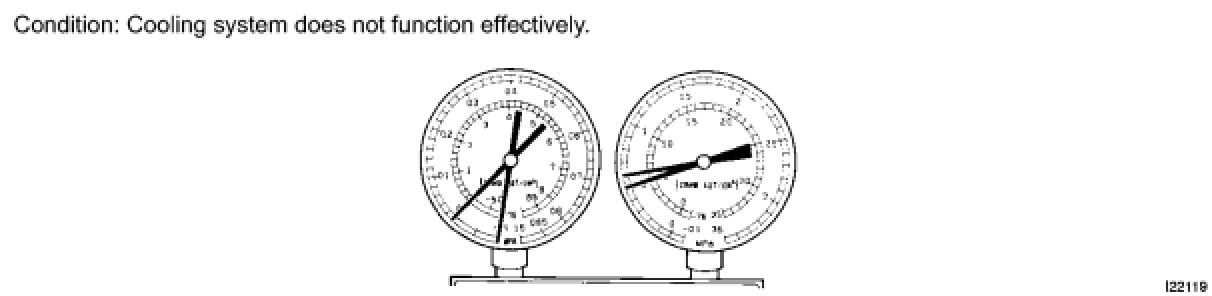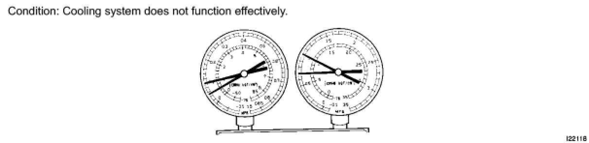 (6) Refrigerant is overcharged or cooling effectiveness of the condenser is insufficient.