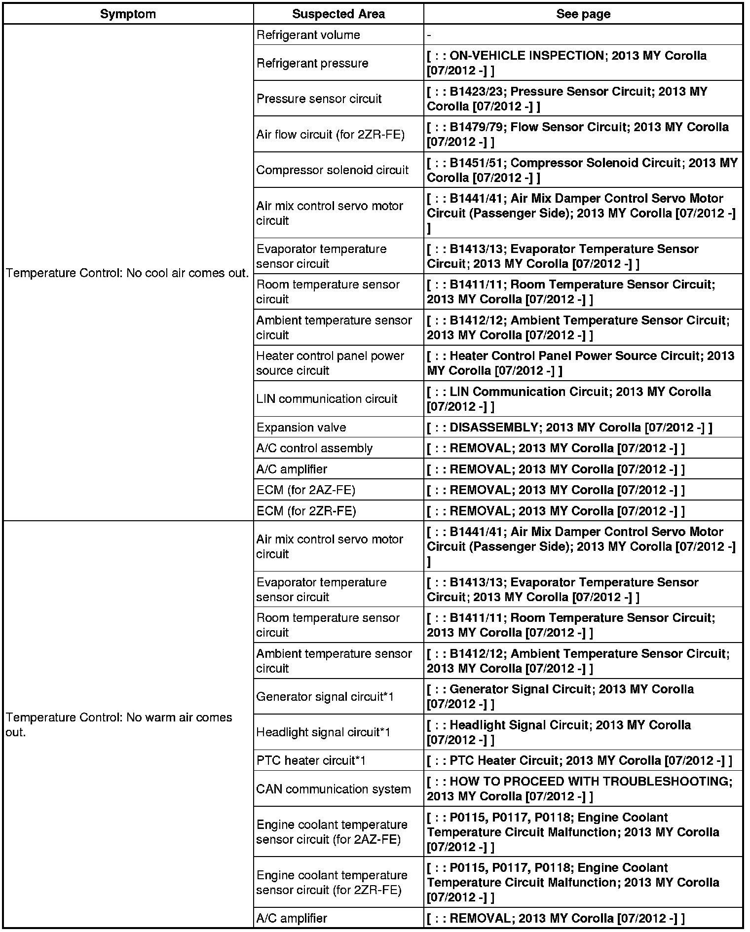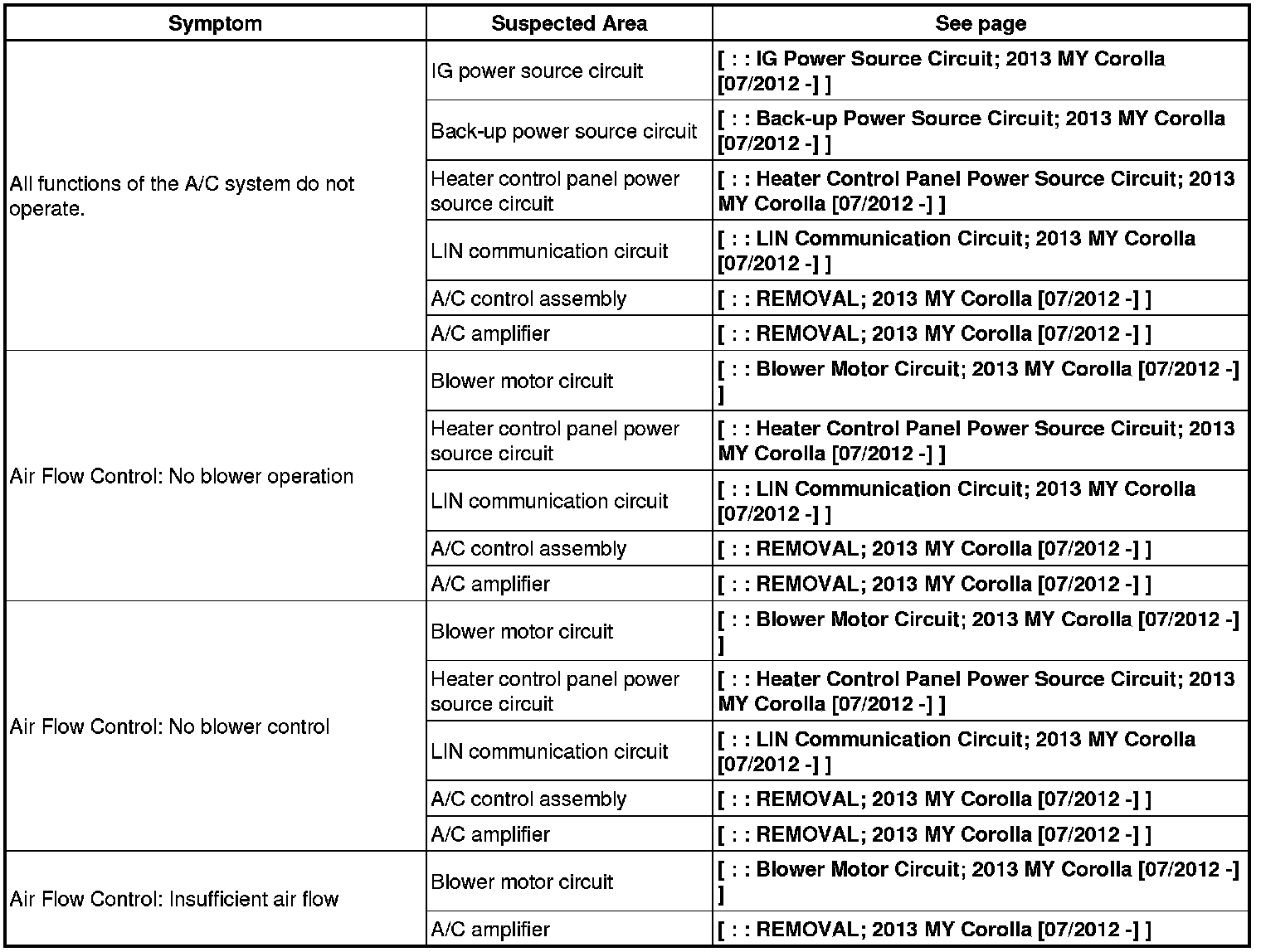 HEATING / AIR CONDITIONING: AIR CONDITIONING SYSTEM (for Automatic Air Conditioning System): PROBLEM SYMPTOMS TABLE; 2013 MY Corolla [07/2012 -]