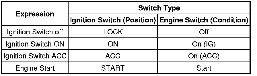 The type of ignition switch used on this model differs according to the specifications of the vehicle. The expressions listed in the table below are used in this information.