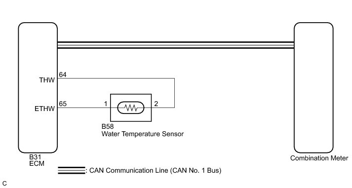 In this circuit, the meter CPU receives engine coolant temperature signals from the ECM using the CAN communication line (CAN No. 1 Bus). The meter CPU displays engine coolant temperature that is calculated based on the data received from the ECM.