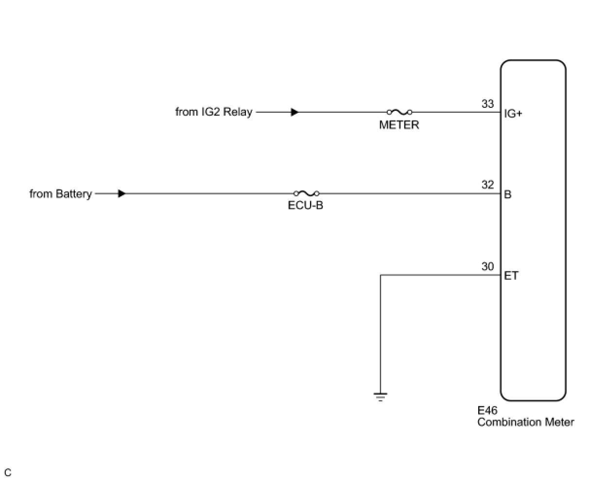 This circuit is the power source circuit for the meter. This circuit provides two types of power sources; one is a constant power source mainly used as a backup power source, and the other is a power source mainly used for signal transmission. The constant power source is mainly used as a backup power source of the meter CPU, however, it is also used for communication. If a voltage of 12 V is not applied to terminal IG+ when the ignition switch is turned to ON, the indicator will not operate.
