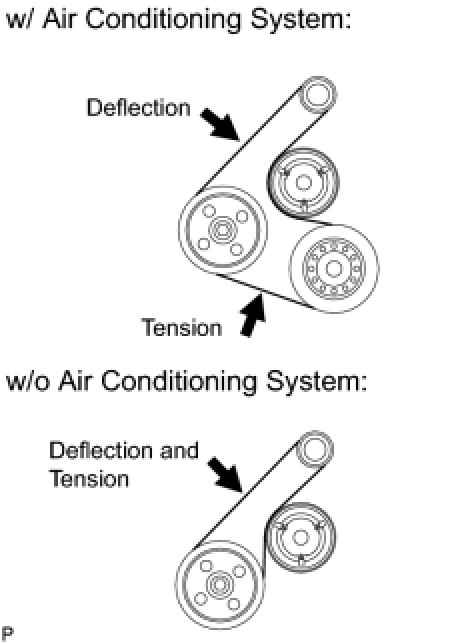* V-ribbed belt tension and deflection should be checked at TDC crank angle and cold condition.