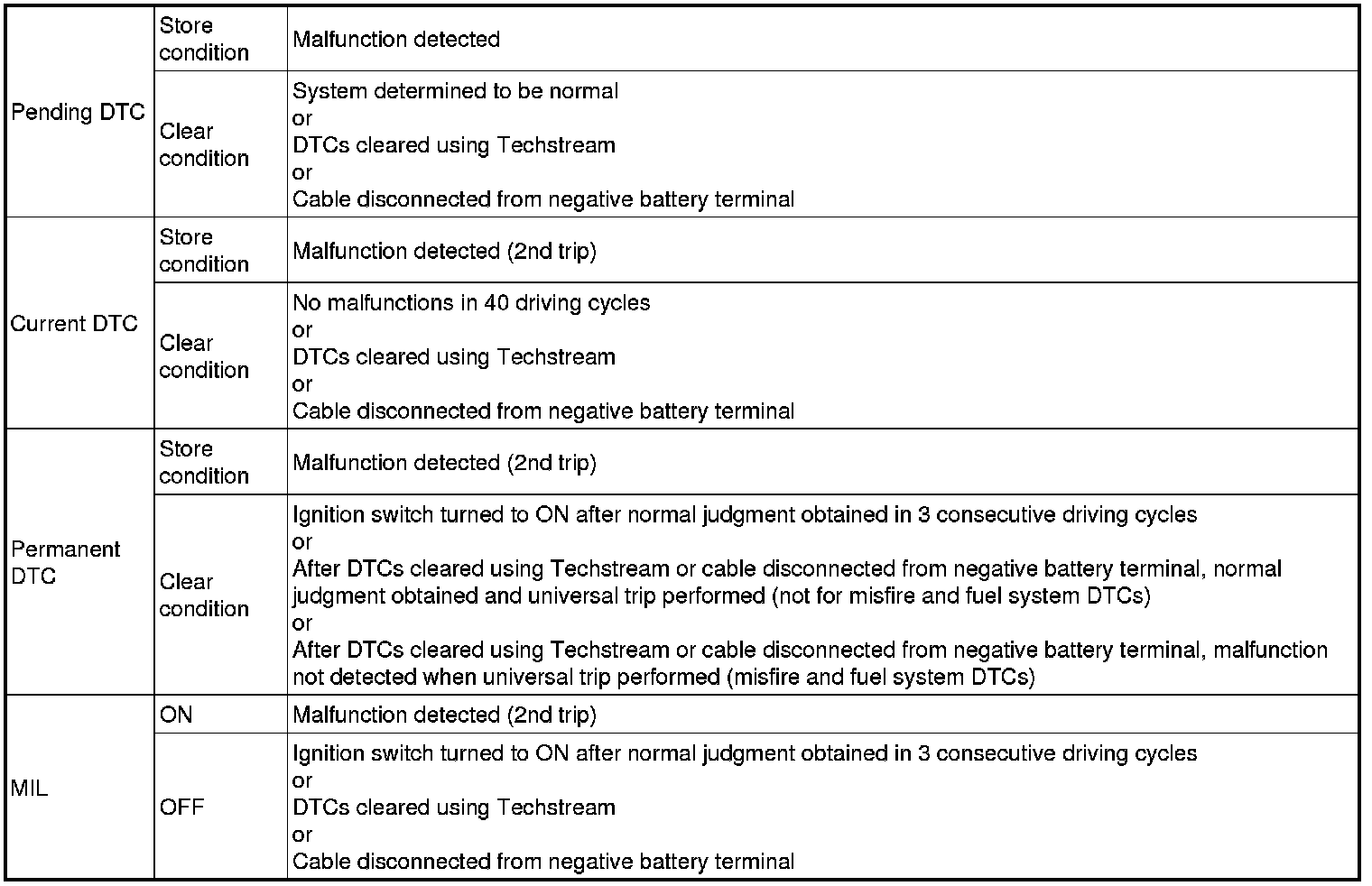 * DTCs which are stored in the ECM can be output to the Techstream. The Techstream can display the current, pending and permanent DTCs.