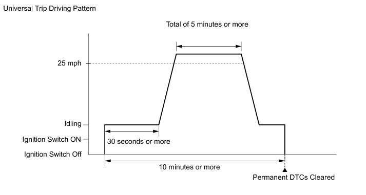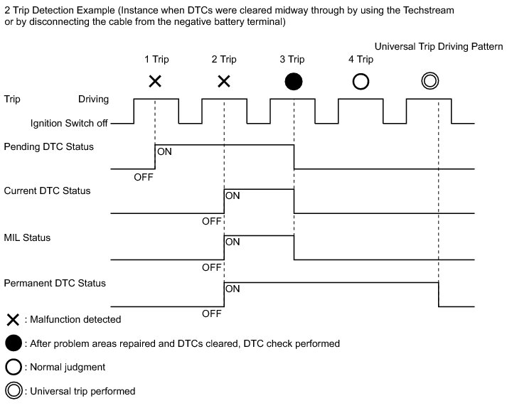 * After clearing current DTCs using the Techstream (or by disconnecting the cable from the negative battery terminal), permanent DTCs can be cleared when the system is determined to be normal for the relevant DTCs and then the universal trip is performed. The driving pattern to obtain a normal judgment is described under the "Confirmation Driving Pattern" for the respective DTC.