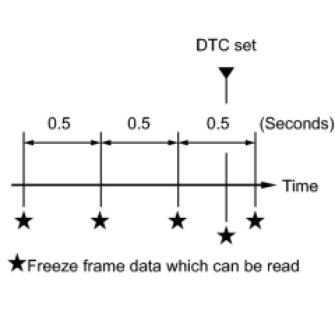 * The ECM records vehicle and driving condition information as freeze frame data the moment a DTC is stored. When troubleshooting, freeze frame data can be helpful in determining whether the vehicle was moving or stationary, whether the engine was warmed up or not, whether the air fuel ratio was lean or rich, as well as other data recorded at the time of a malfunction.