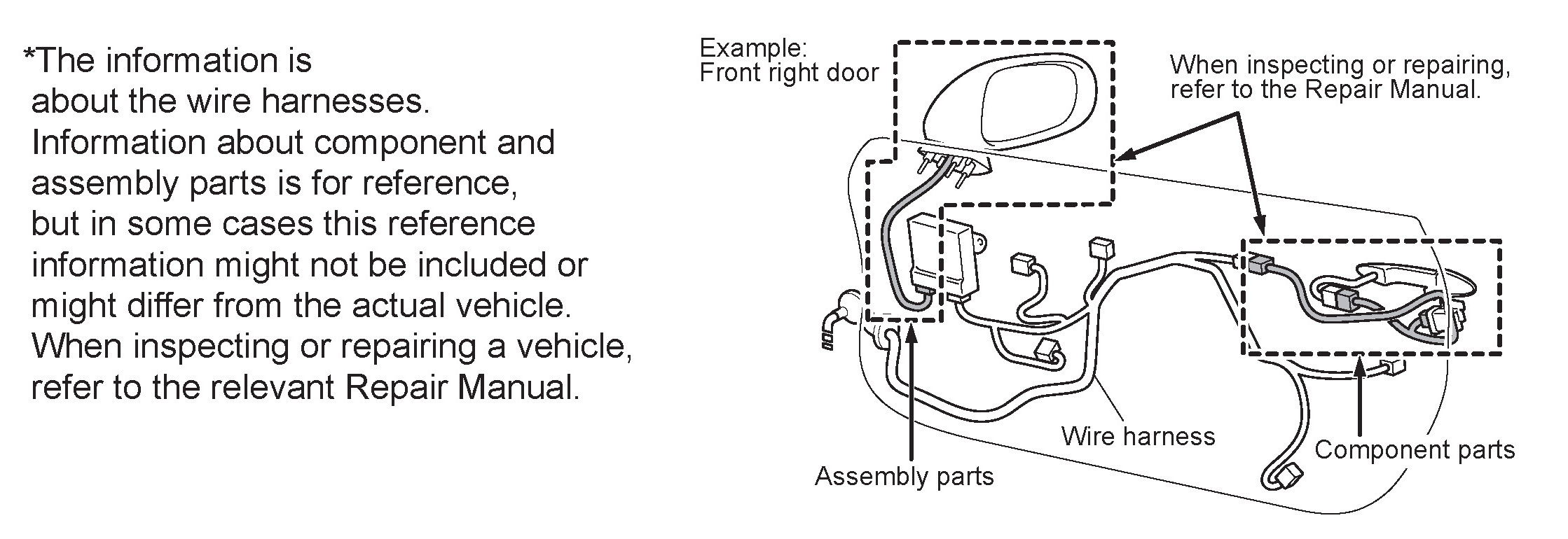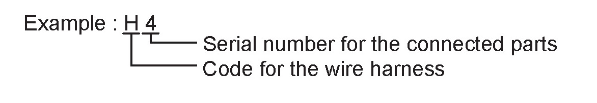* The first character of the code indicates the alphabetical code allocated to the wire harness, and the second character indicates the serial number of the parts connected to the wire harness.
