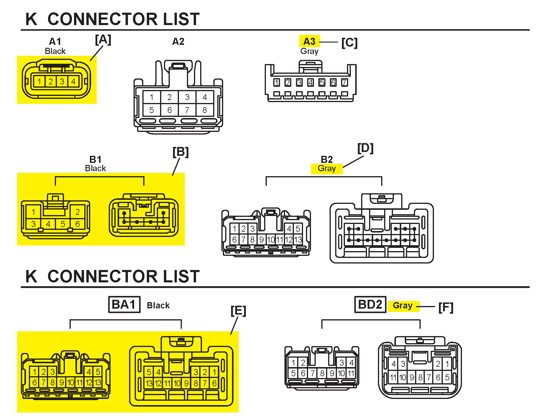 [E] : Indicates the connector shapes which are used to join wire harnesses.