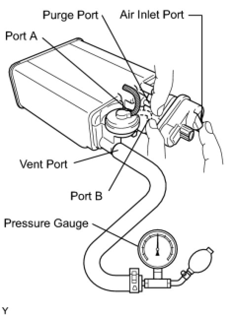 (1) With the purge port and air inlet port closed, apply 19.6 kPa (0.2 kgf/cm2, 2.81 psi) of pressurized air into the vent port, then confirm that pressure is retained for 1 minute.