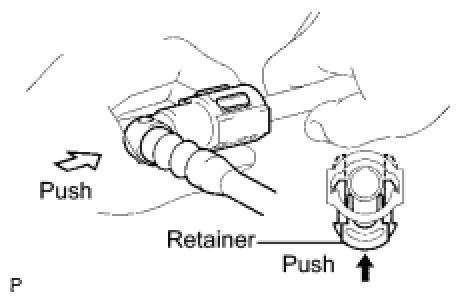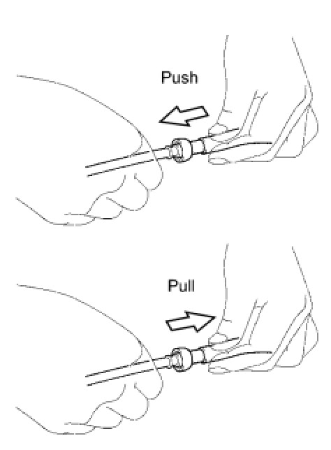 (2) Match the axis of the connector with the axis of the pipe, and push the pipe into the connector until the connector makes a "click" sound. If the pipe is difficult to push into the connector, apply a small amount of clean engine oil to the tip of the pipe.