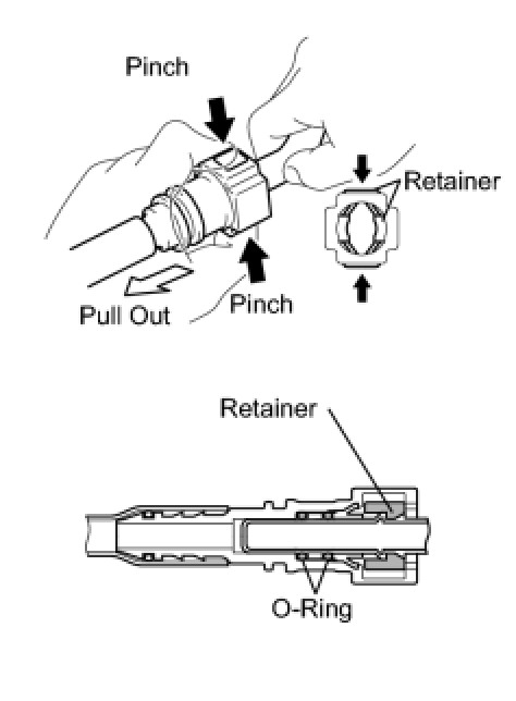 (2) Pinch the tabs of the fuel tube retainer to disengage the 2 claws. Push the retainer down as shown in the illustration