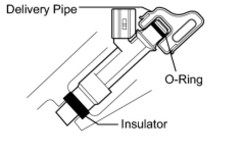 (b) Install the injector into the delivery pipe and cylinder head as shown in the illustration. Apply grease or gasoline to the contact surfaces of the injector before installing the injector.