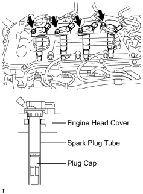 When removing each ignition coil, do not damage the plug cap on the engine head cover opening or the upper edge of the spark plug tube.