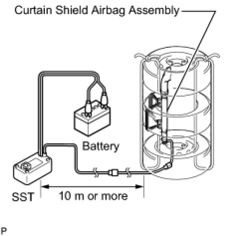 * When deploying the airbag, perform the operation at least 10 m (33 ft.) away from the curtain shield airbag assembly.