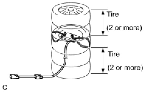 (1) Place at least 2 tires under the tire to which the front seat side airbag assembly is tied.