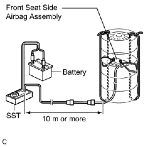 * When deploying the airbag, perform the operation at least 10 m (33 ft.) away from the front seat side airbag assembly.