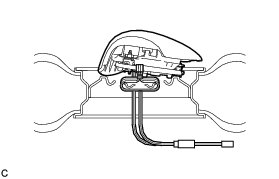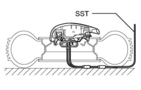 (4) Face the airbag deployment side of the steering pad upward on top of an unneeded tire and wheel set. Separately tie the left and right sides of the steering pad to the wheel through the hub nut holes. Position the SST connector so that it hangs downward through the hub hole of the wheel.