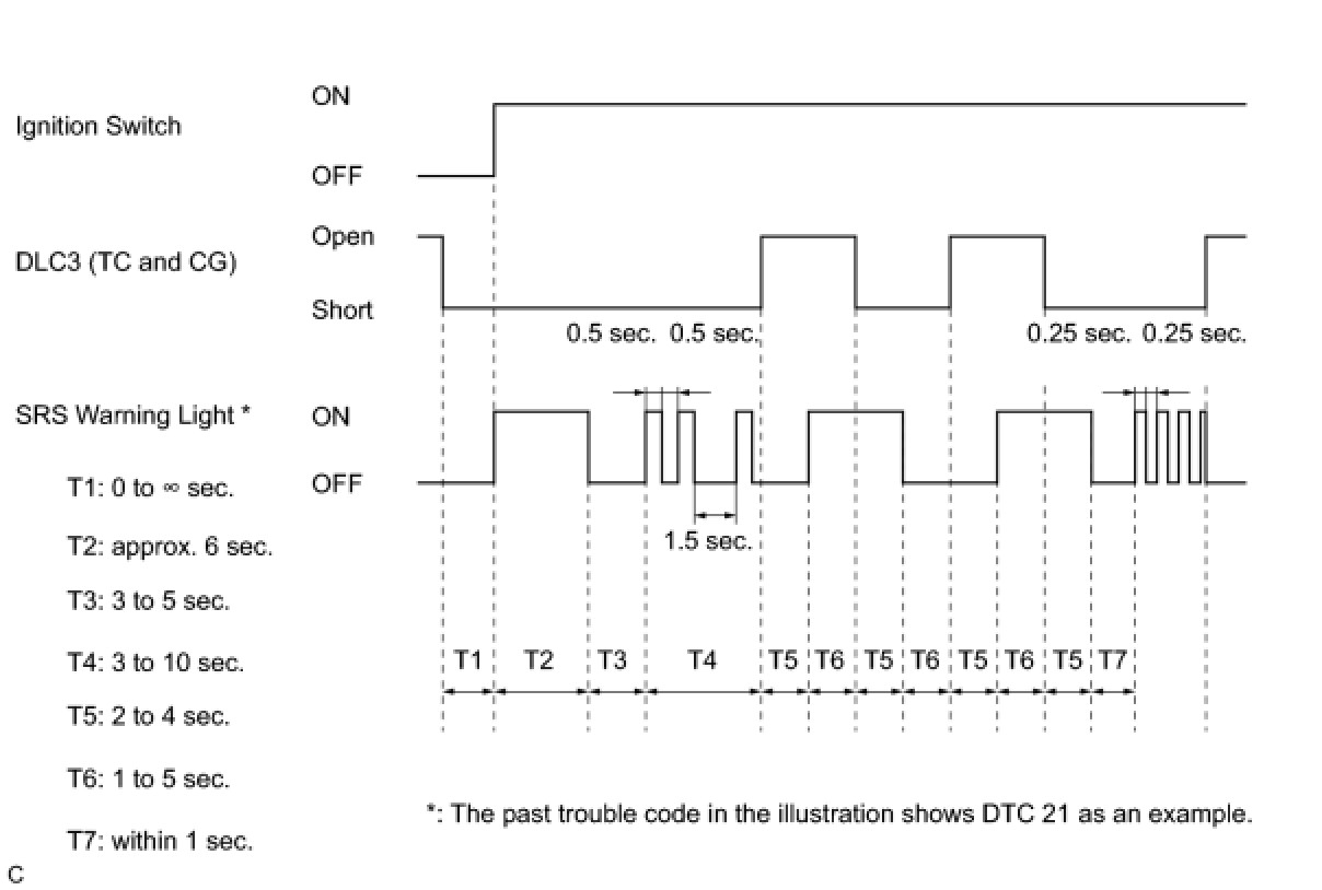 (5) The SRS warning light should go off within 2 to 4 seconds after connecting terminals TC and CG of the DLC3. Then, disconnect terminal TC within 2 to 4 seconds after the SRS warning light goes off.