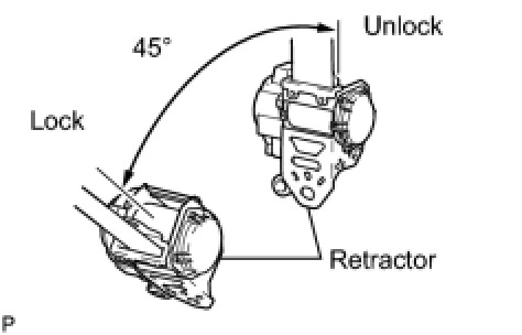 (1) When the inclination of the retractor is 15° or less, check that the belt can be pulled from the retractor. When the inclination of the retractor is over 45°, check that the belt locks.