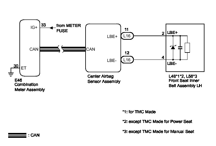 When the ignition switch is on (IG), the center airbag sensor assembly transmits front seat inner belt status signals to the combination meter assembly through CAN. If the driver seat belt is not fastened, the combination meter assembly blinks the driver seat belt warning light. If the seat belt is fastened, the warning light goes off.