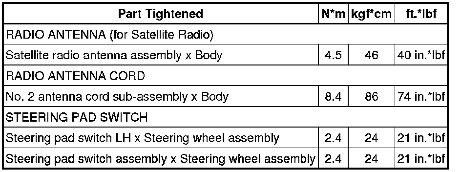 SPECIFICATIONS: AUDIO / VIDEO: TORQUE SPECIFICATIONS; 2013 MY Corolla [07/2012 -]