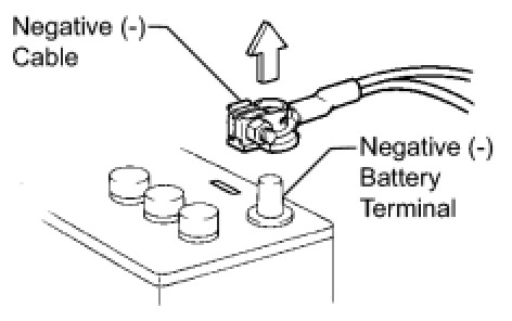 (1) Before performing electrical work, disconnect the cable from the negative (-) battery terminal to prevent component and wire damage caused by accidental short circuits.