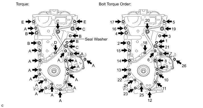 Fully tighten the timing chain cover sub-assembly with the 26 bolts as shown in the illustration.