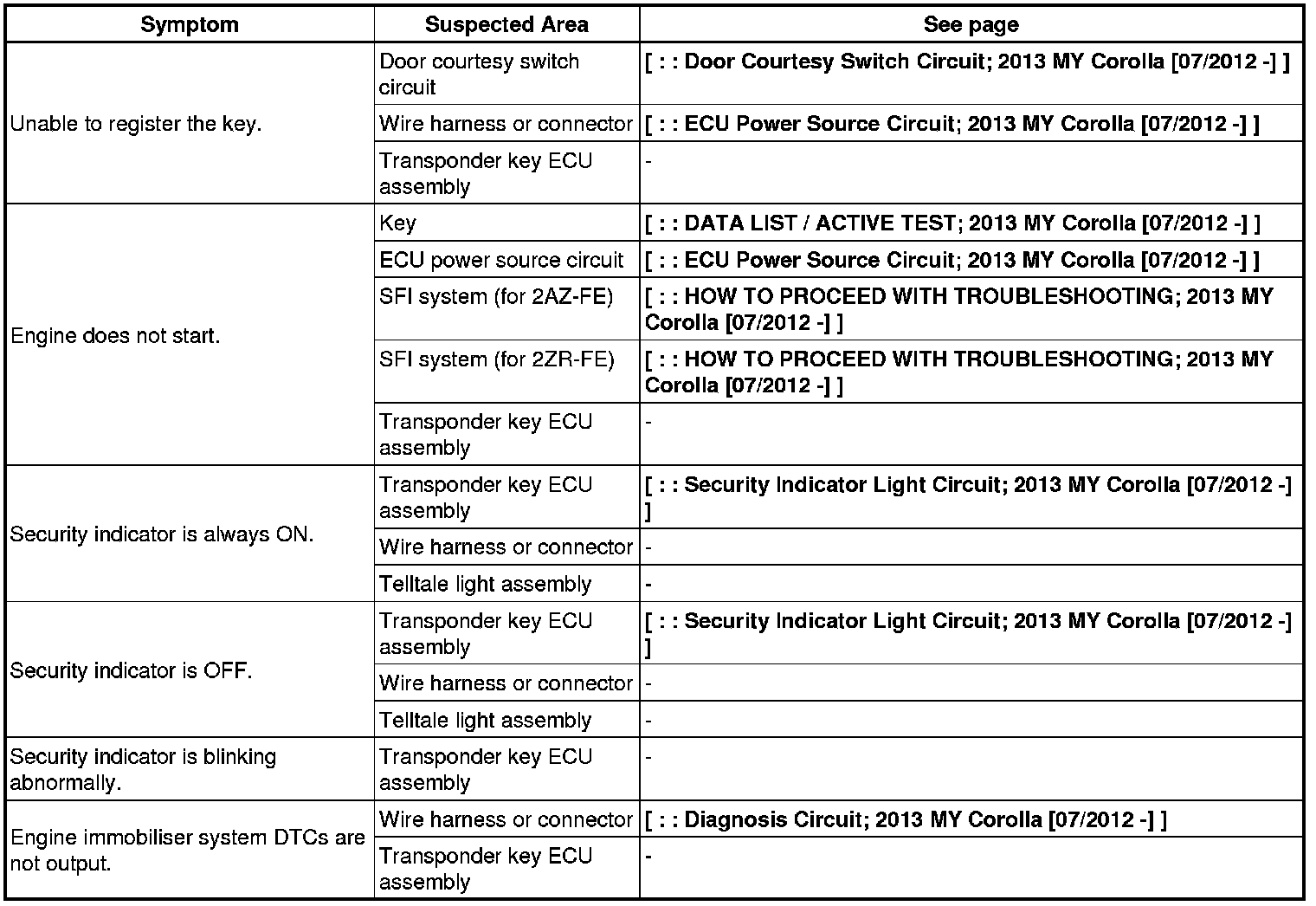 THEFT DETERRENT / KEYLESS ENTRY: ENGINE IMMOBILISER SYSTEM (w/o Smart Key System): PROBLEM SYMPTOMS TABLE; 2013 MY Corolla [07/2012 -]