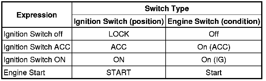 The type of ignition switch used on this model differs according to the specifications of the vehicle. The expressions listed in the table below are used in this information.