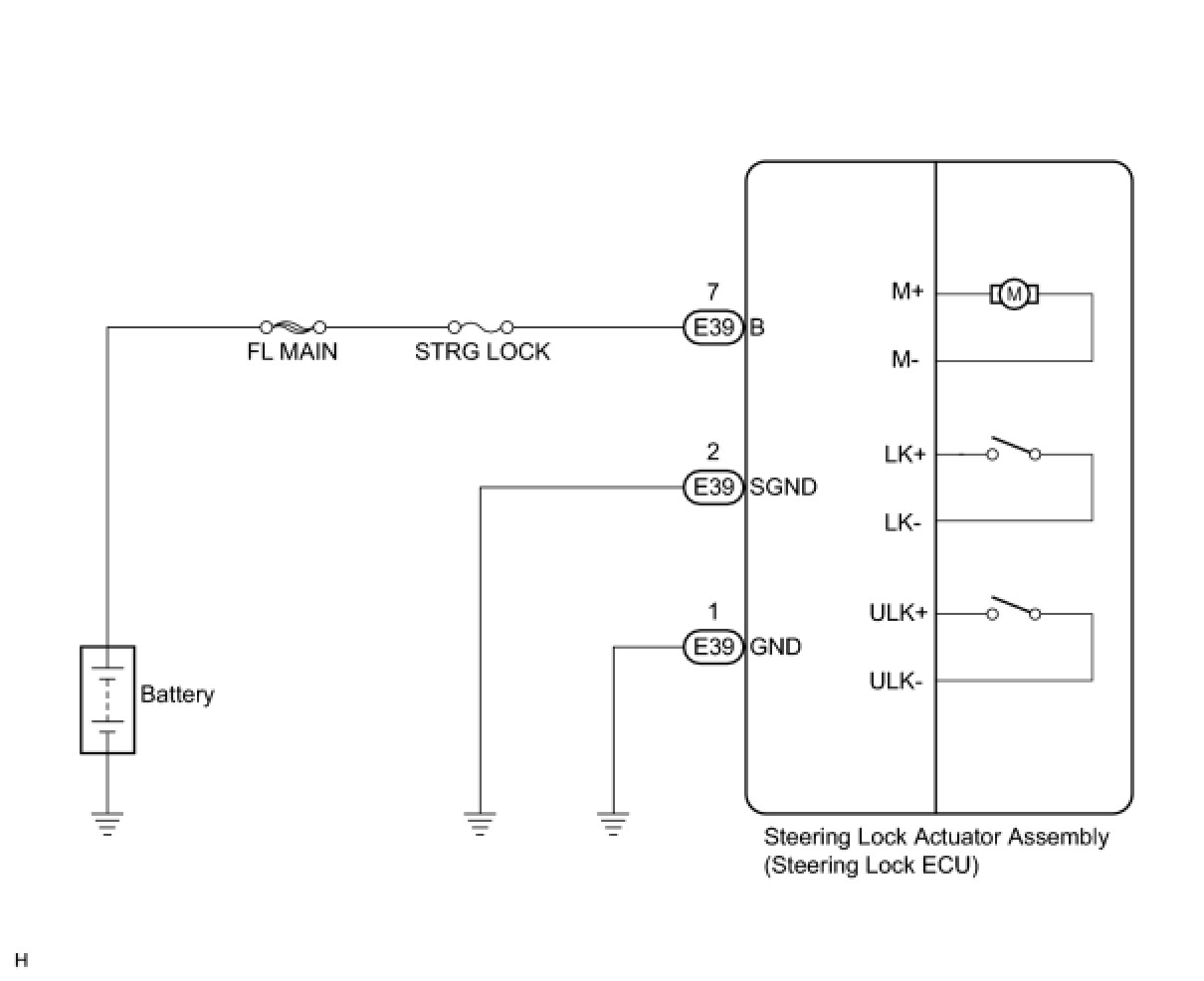 This circuit supplies voltage from the battery to terminal B of the steering lock ECU. This circuit is used as power source for the steering lock ECU, motor, communication, and peripheral circuits.