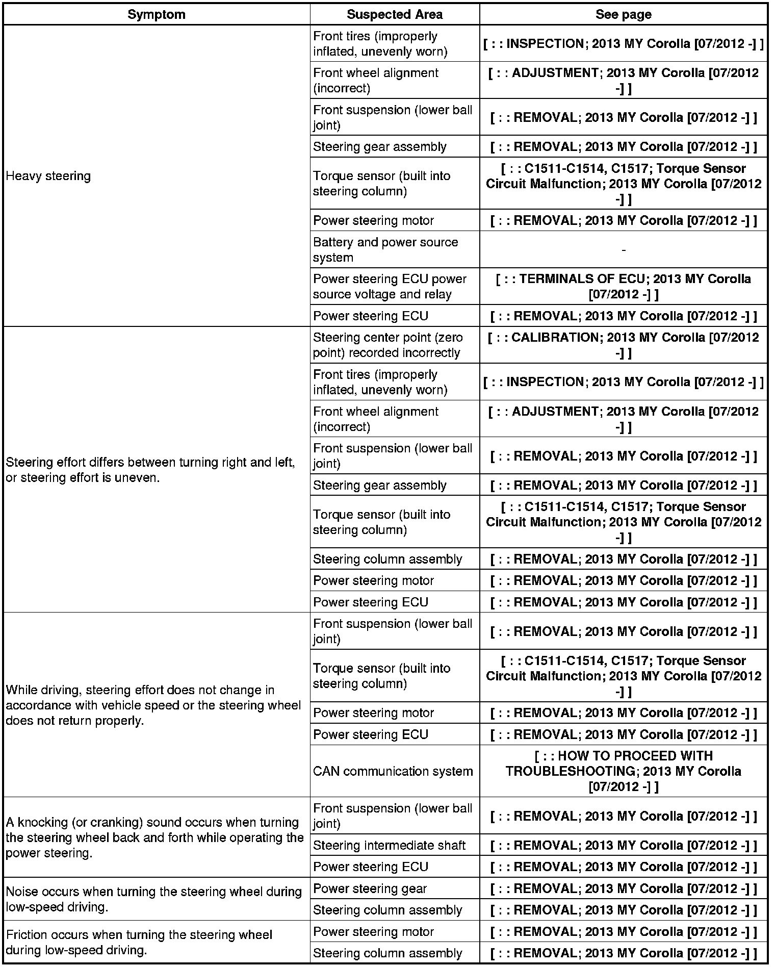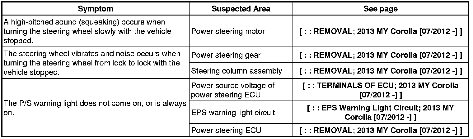 POWER ASSIST SYSTEMS: POWER STEERING SYSTEM (for 2ZR-FE): PROBLEM SYMPTOMS TABLE; 2013 MY Corolla [07/2012 -]