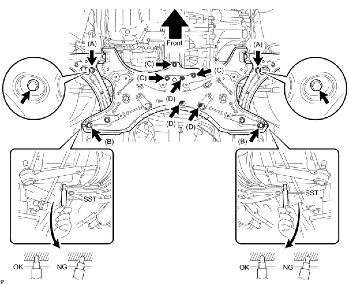 (1) While alternately inserting SST into the guide holes on both sides of the front suspension crossmember RH and LH, tighten 2 bolts (A), 2 bolts (B), 3 bolts (C), and 3 nuts (D) on the RH and LH sides to the respective specified torque in several steps.