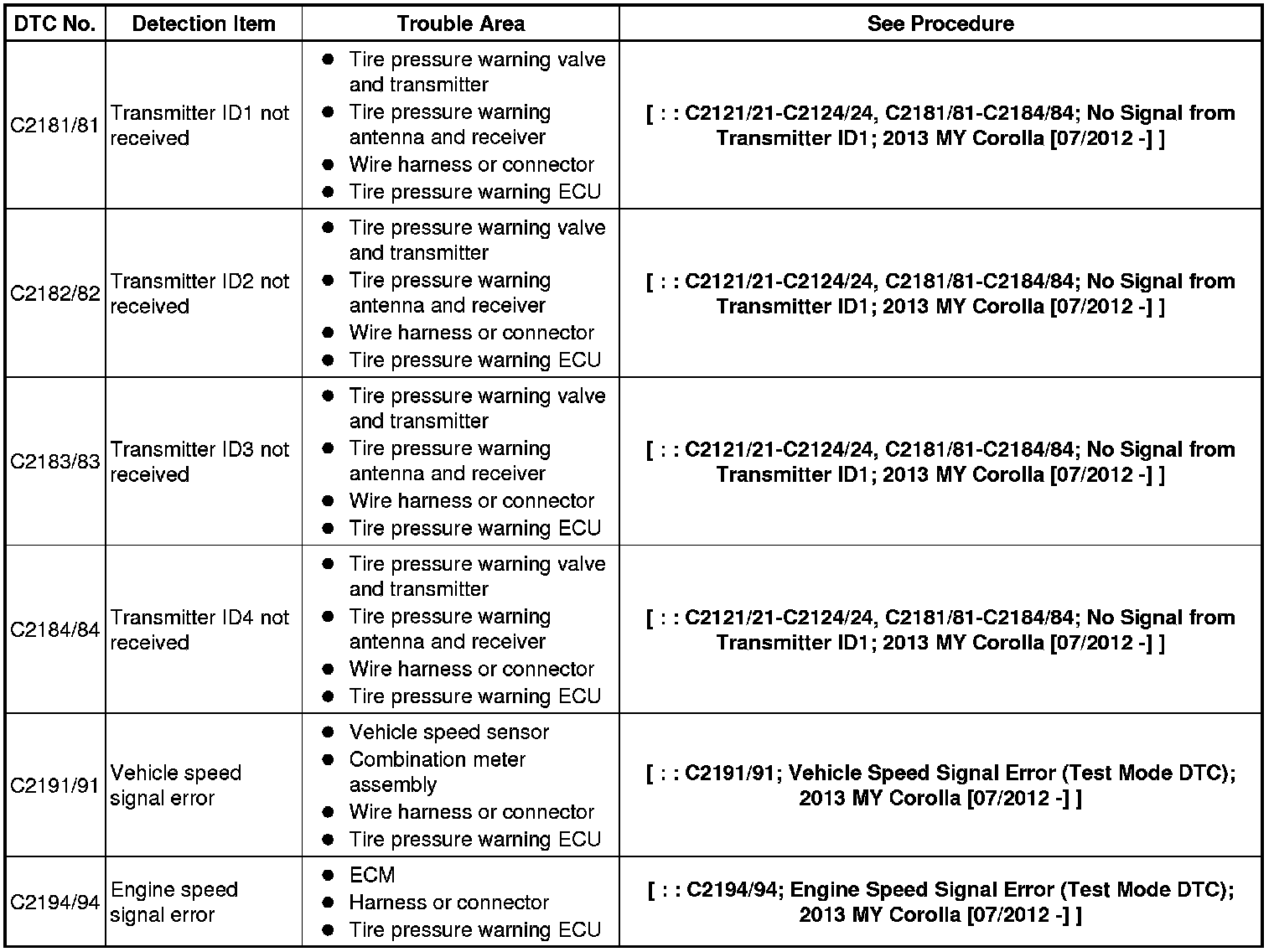 TIRE PRESSURE MONITORING: TIRE PRESSURE WARNING SYSTEM: TEST MODE PROCEDURE; 2013 MY Corolla [07/2012 -]