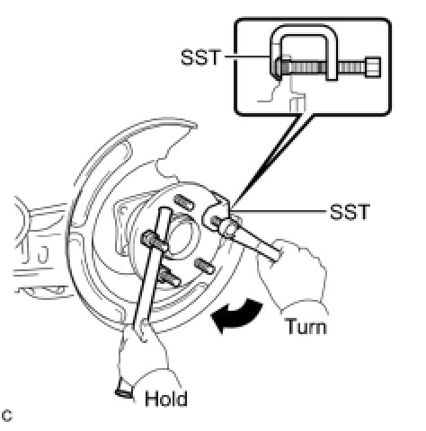 (b) Using SST and a brass bar or an equivalent tool to hold the hub and bearing assembly, remove the rear axle hub bolt.