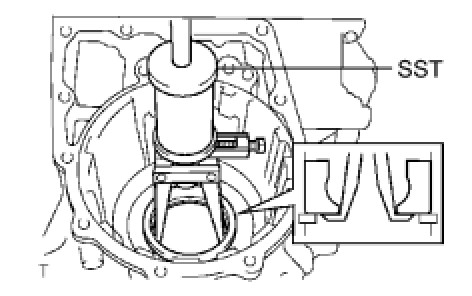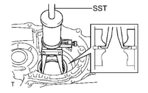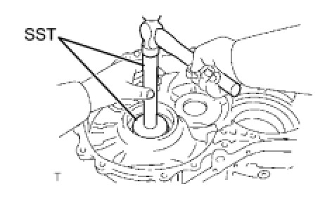 (a) Using SST, remove the front drive pinion front tapered roller bearing from the transaxle housing.