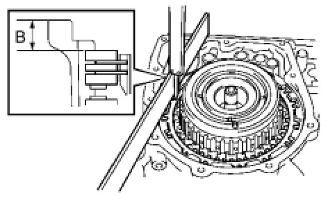 (a) As shown in the illustration, place a straightedge on the transaxle case and measure the distance between the 2nd coast and overdrive brake flange and the straightedge using a vernier caliper. (Dimension B)