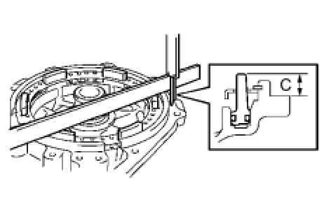 (b) As shown in the illustration, place a straightedge on the overdrive brake piston and measure the distance between the transaxle rear cover and straightedge using a vernier caliper. (Dimension C)