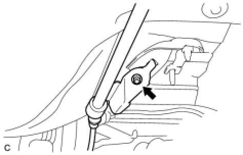 (d) Rotate the nut counterclockwise approximately 180°, and while holding the nut in place, disconnect the transmission control cable from the shift lever retainer.