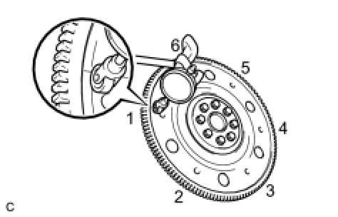 (b) Set up a dial indicator and measure the run out of the 6 portions around the torque converter assembly fitting surfaces.