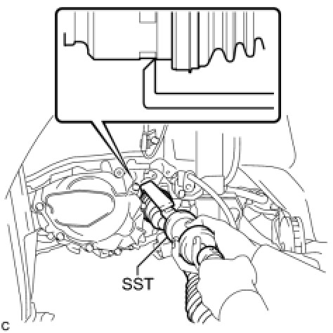 The hub bearing could be damaged if it is subjected to the vehicle weight, such as when moving the vehicle with the drive shaft removed. Therefore, make sure to support the hub bearing with SST when the vehicle weight is applied.
