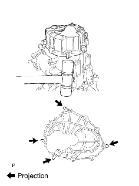 (b) Using a plastic hammer, carefully tap the projections of the manual transmission case cover sub-assembly to remove the manual transmission case cover from the manual transmission case.