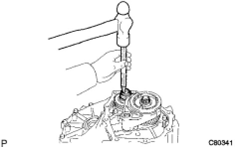(a) Using a chisel and a hammer, loosen the staked part of the manual transmission output shaft rear set nut.