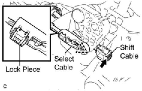 (c) Push the two claws together at the top of the transmission control cable lock piece. While holding the two claws together, push the two lugs on the bottom of the lock piece toward each other and upward to pull out the lock piece.